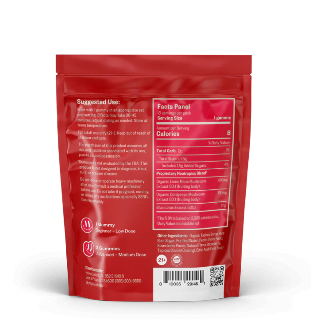 Organic Tapioca Syrup, Beet Sugar, Purified Water, Pectin, Natural Fruit Concentrate (Coloring), Natural Berry Flavoring, Blue Lotus Nootropic Blend.